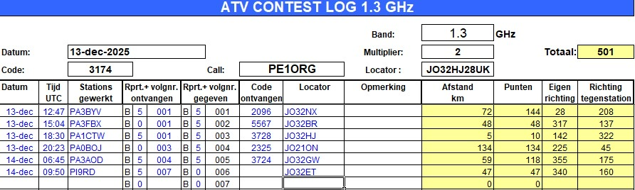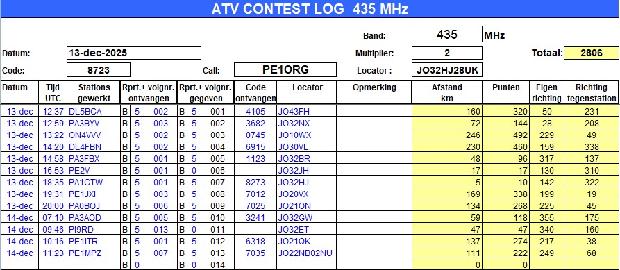 Door ziekte heb ik het hele jaar nog niet echt aan een ATV contest meegedaan. Maar ik wilde het dit weekend toch weer even een paar uurtjes proberen. En het was super intensief, maar wel heel leuk om weer even mee te doen en met in achtneming van de nodige rustmomentjes, redelijk te doen. Uiteindelijk heb ik ‘slechts’ met 13 stations een verbindingen gemaakt, maar het was voor nu meer dan voldoende. Ik heb alle 13 stations met DATV (Digitale TV) gewerkt op 70cm (zelfs 246km helemaal naar België) en 6 hiervan ook op 23cm en zelfs 1 hiervan ook op 3cm. Een super goed resultaat, al zeg ik het zelf 🙂